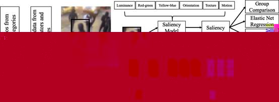 在本研究中,我們對監控專家和無經驗的普通人在觀看相同監控錄像時的眼動軌迹進行了分析。研究基于眼動捕捉技術,收集被試觀看視頻時的注視點,進而對以注視點為中心的圖像刺激進行了計算分析。為了提取視覺特征,研究使用了兩種計算模型:顯著性模型(Saliency model)和深度卷積神經網絡模型 (CNN model)。如圖所示,顯著性模型用于捕捉吸引注意力的低級圖像特征(如,顔色、運動、朝向信号),而深度卷積神經網絡模型則用于提取CNN全連接層中抽象高級的視覺特征,以捕捉被試關注視覺場景中的語義信息。